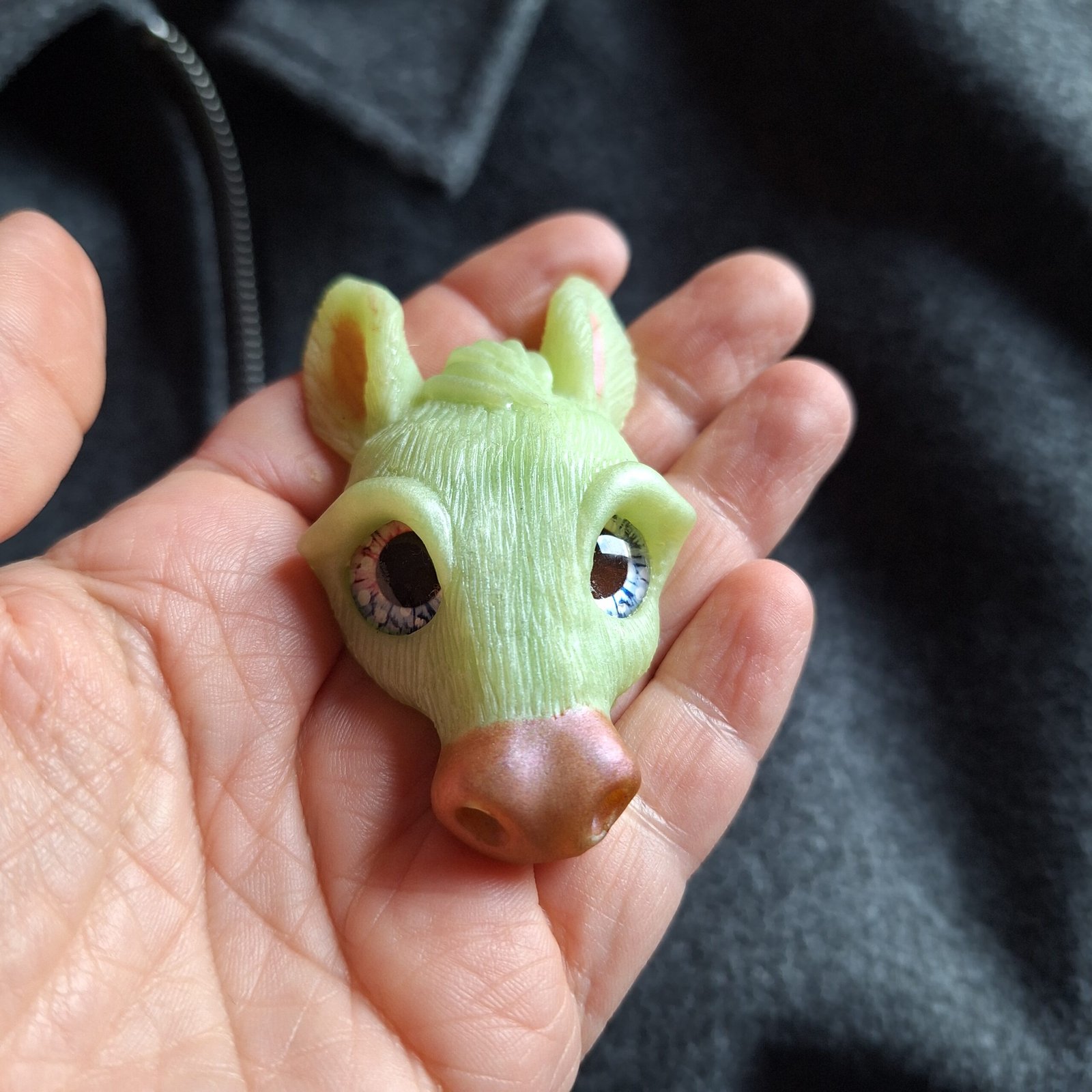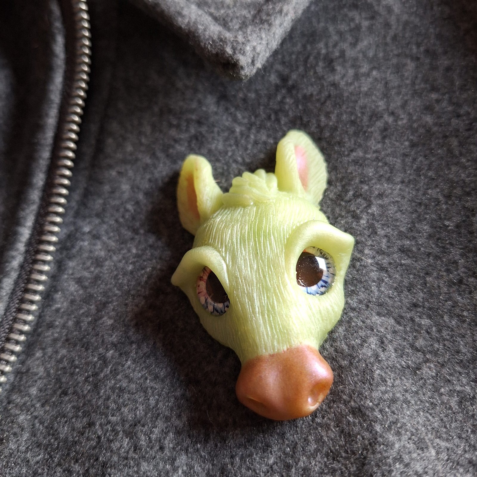Broche cheval de style art toy kawaï a été sculptée en monsterclay, moulée puis coulée en résine époxy. Ses yeux en verre lui donne beaucoup d’expression.