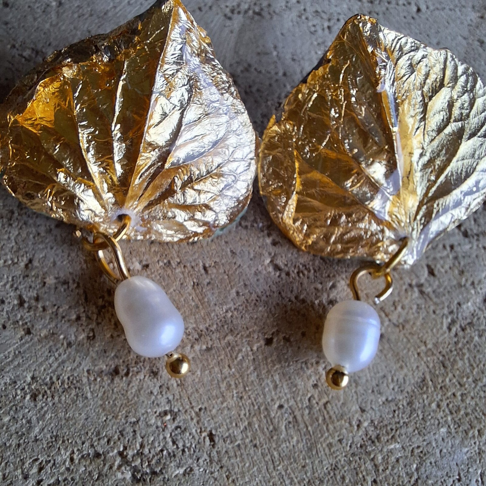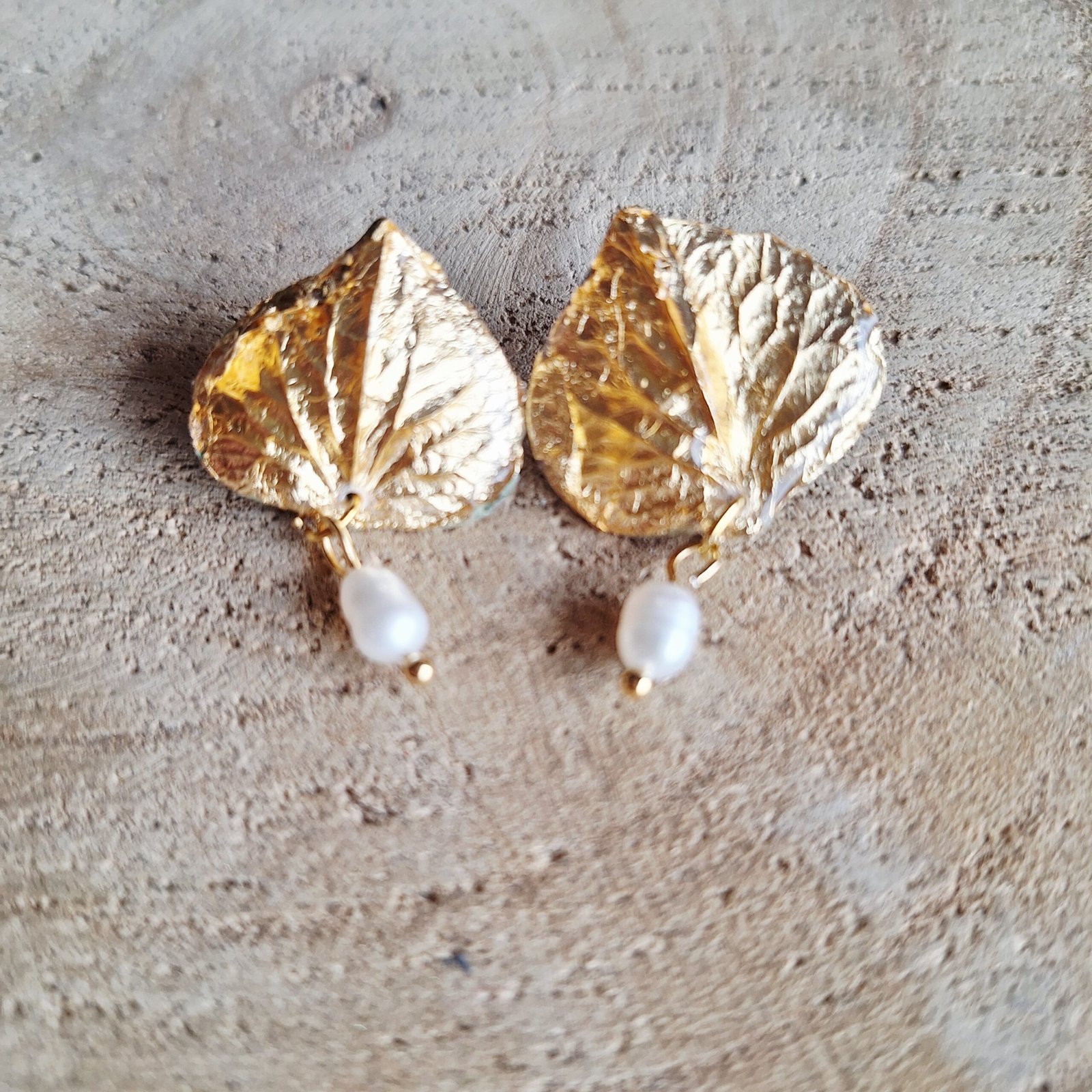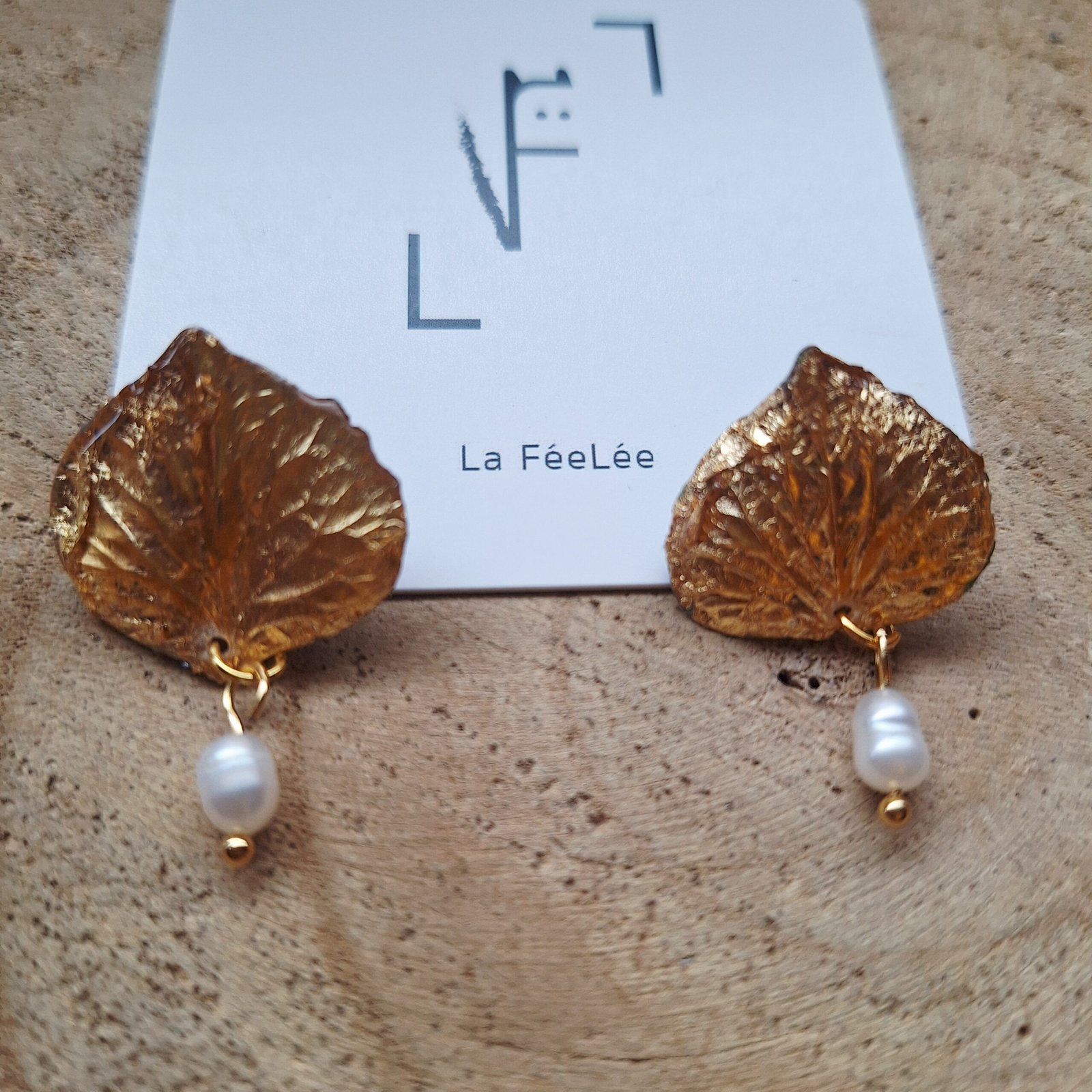 Petits pétales d’Hortensia séchés, recouverts de feuilles d’or, de résine et accompagnés chacun d’une petite perle de culture d’eau douce mobile sous le pétale.