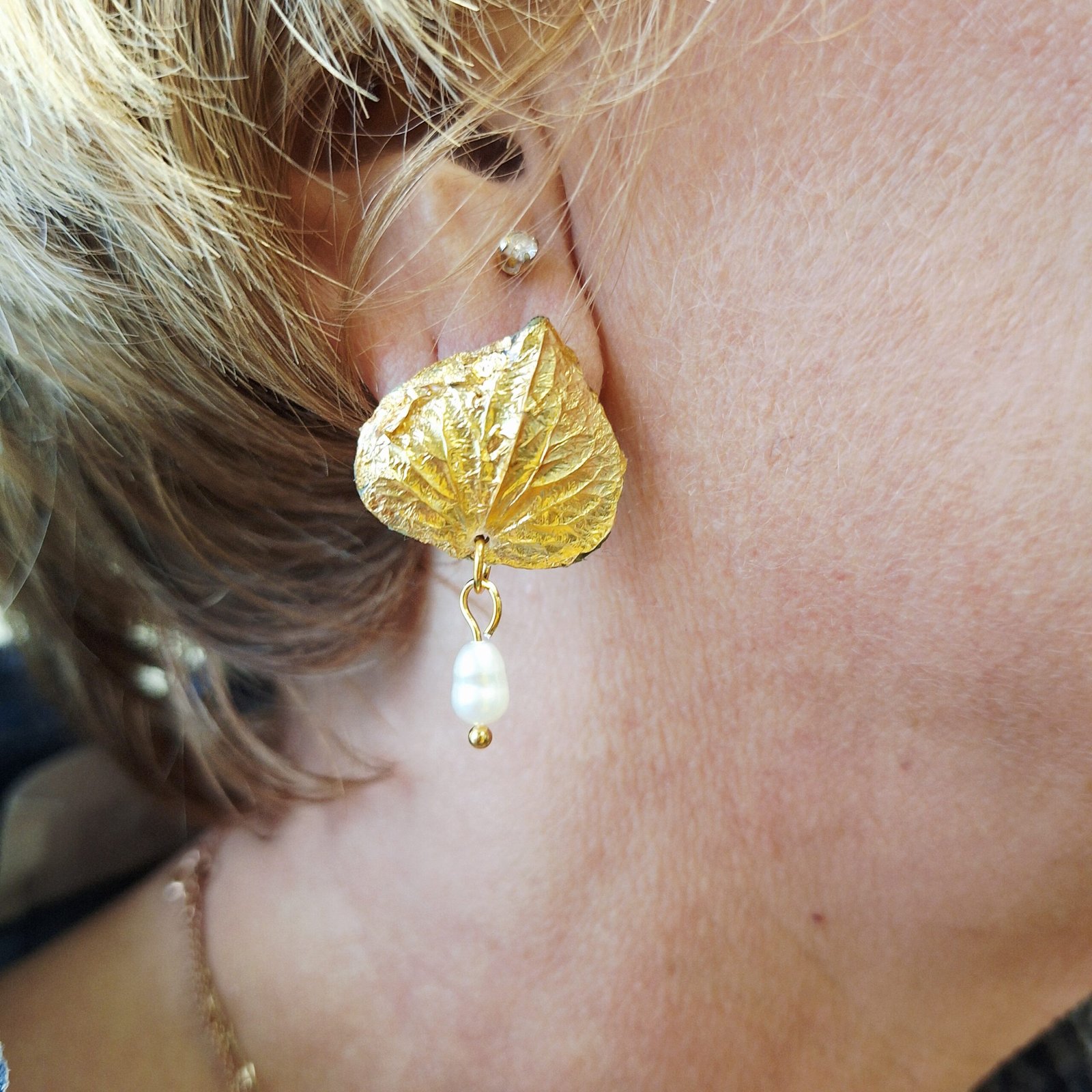 Cette paire de boucle, très légère et assez courte ( voir la photo portée) est élégante et poétique, une tige en acier inoxydable est placée sur l’arrière de la feuille et la boucle se ferme a l’aide d’un papillon en silicone.