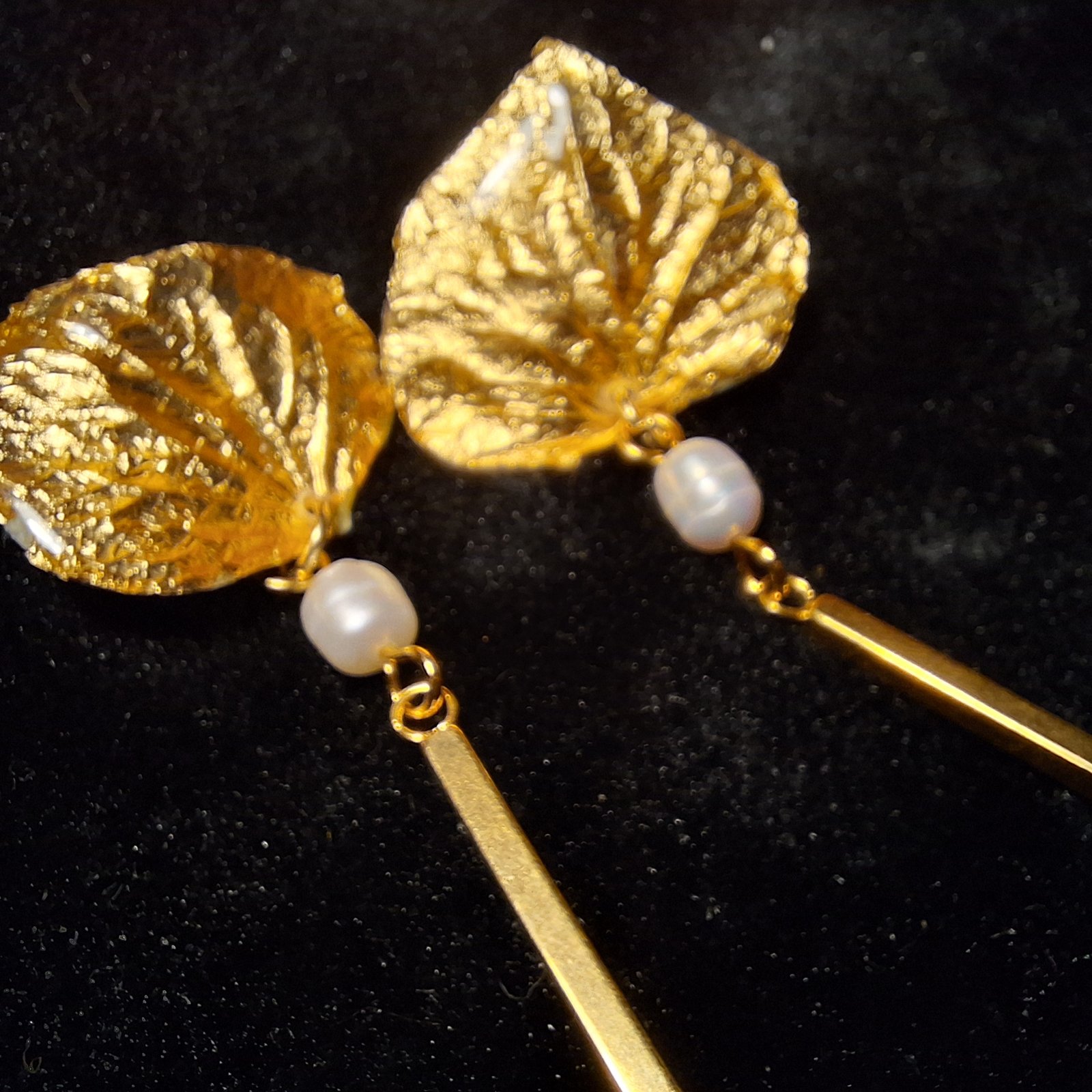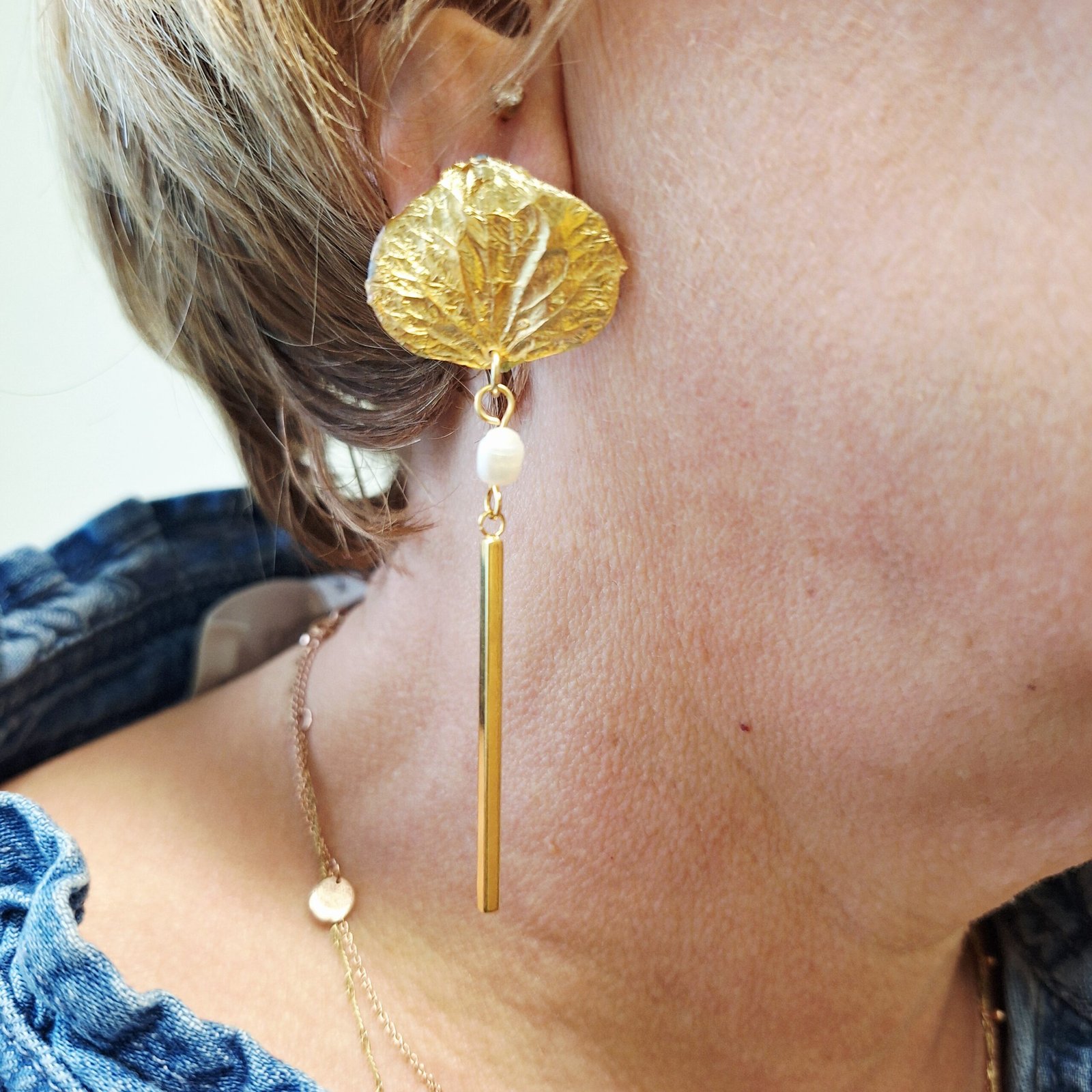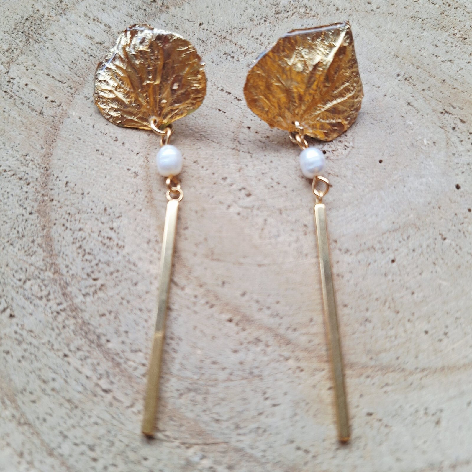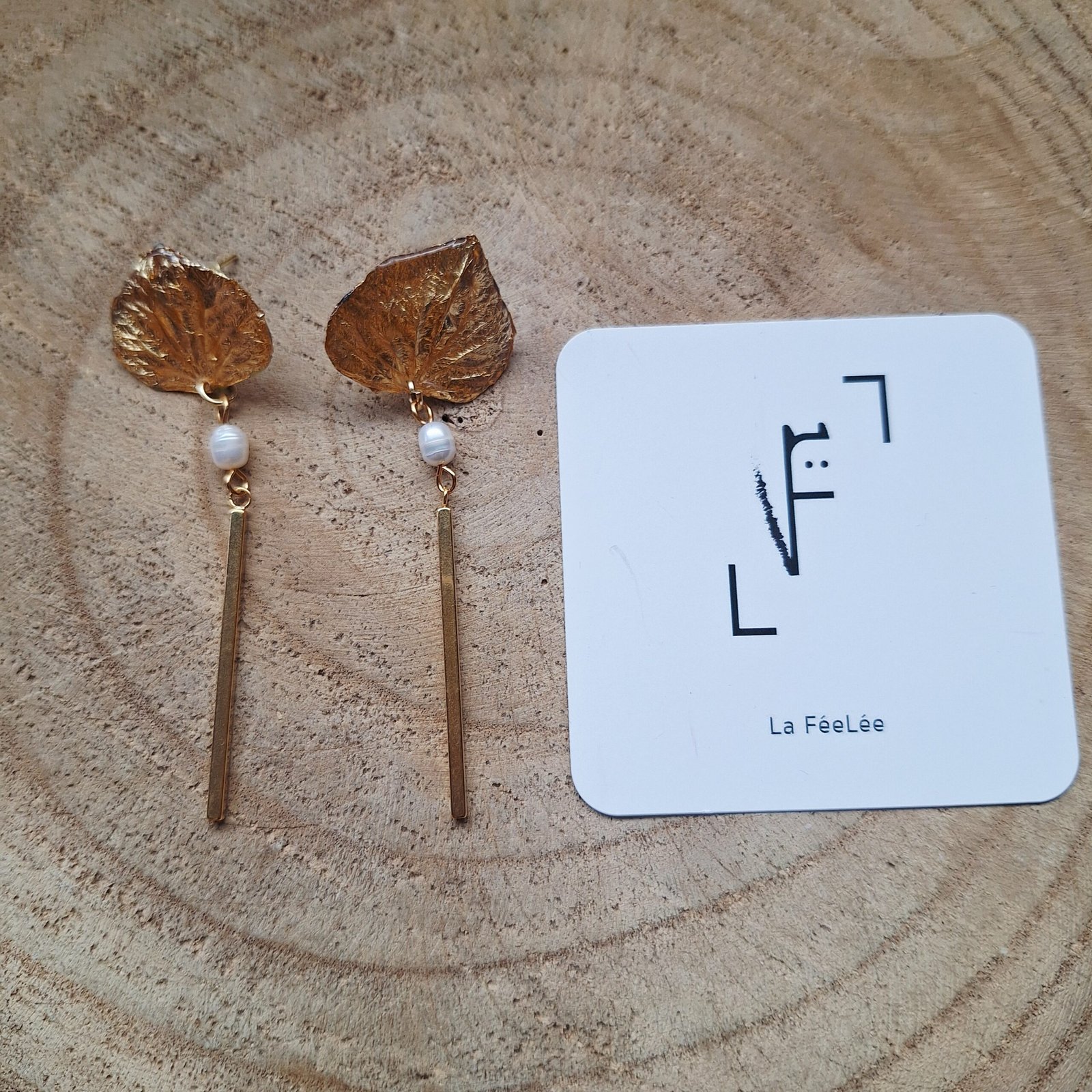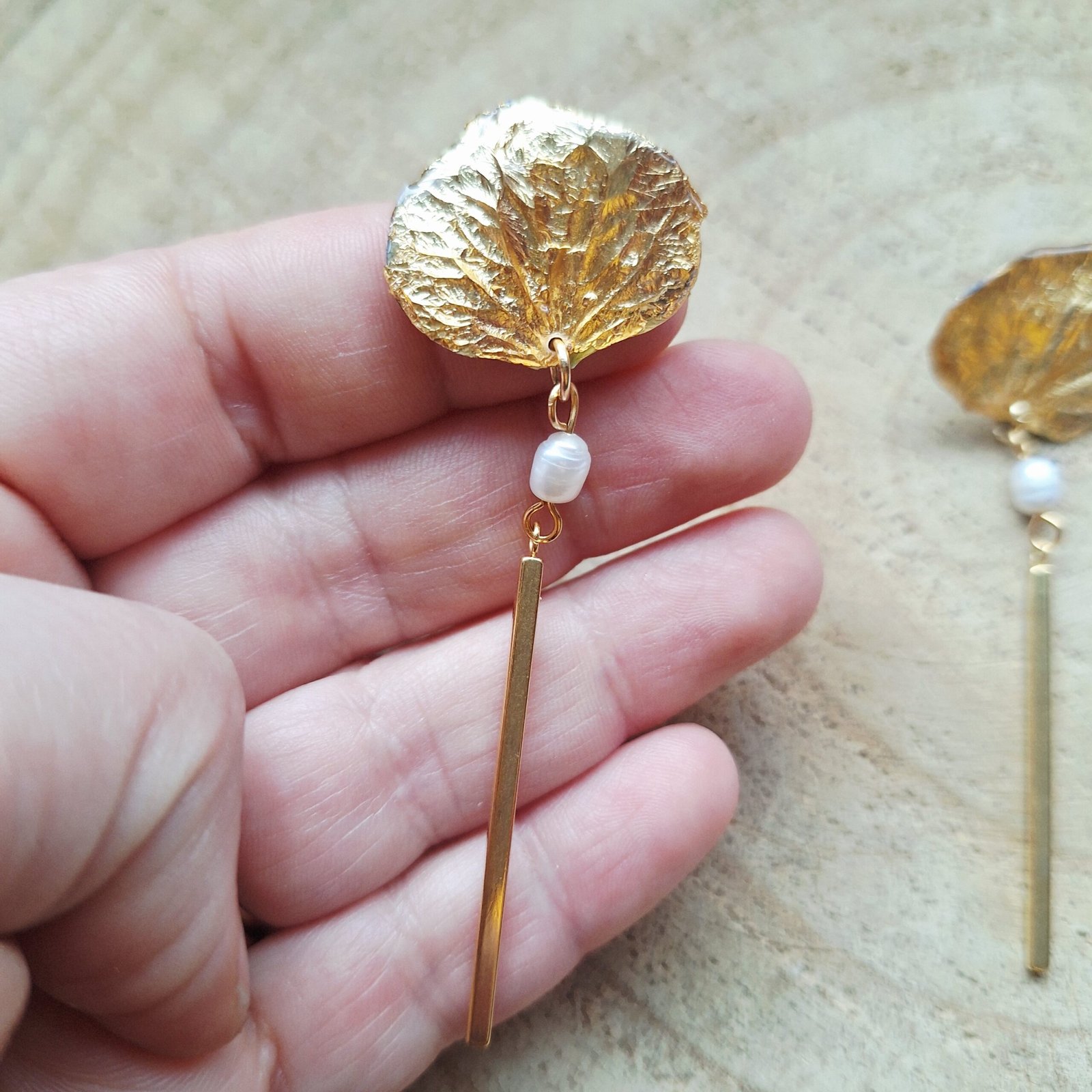 Pétales d’Hortensia séchés, recouverts de feuilles d’or, de résine et accompagnés d’une perle de culture d’eau douce et d’un pendant carillon en inox doré.