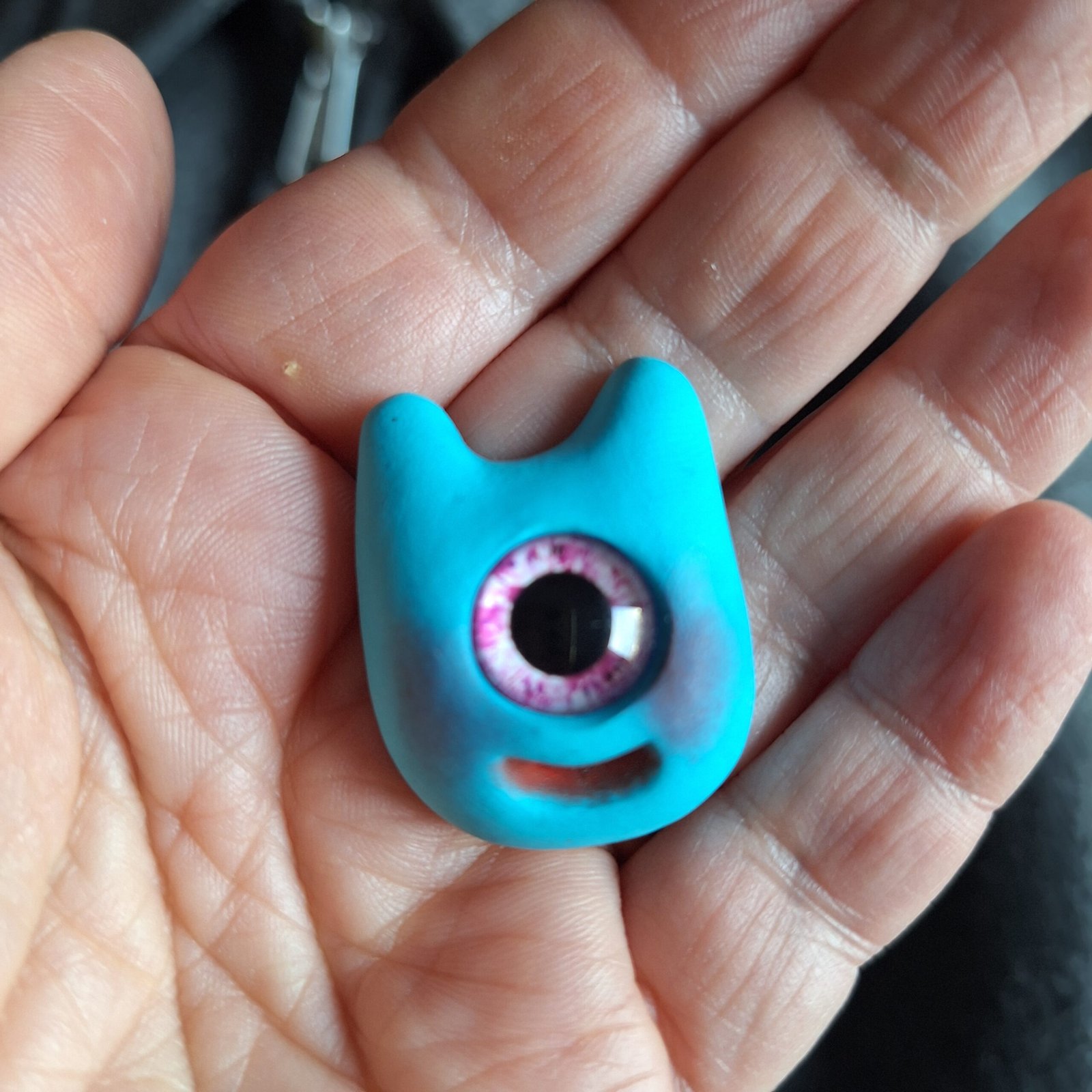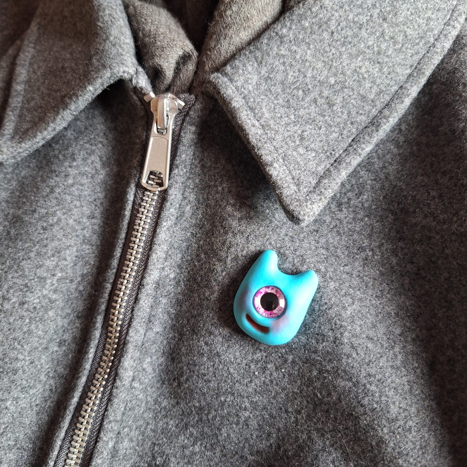 Petit Pin’s sculpté en pâte polymère, yeux en verre. Sa taille en centimètres se trouve sur la seconde photo. Pièce unique.
