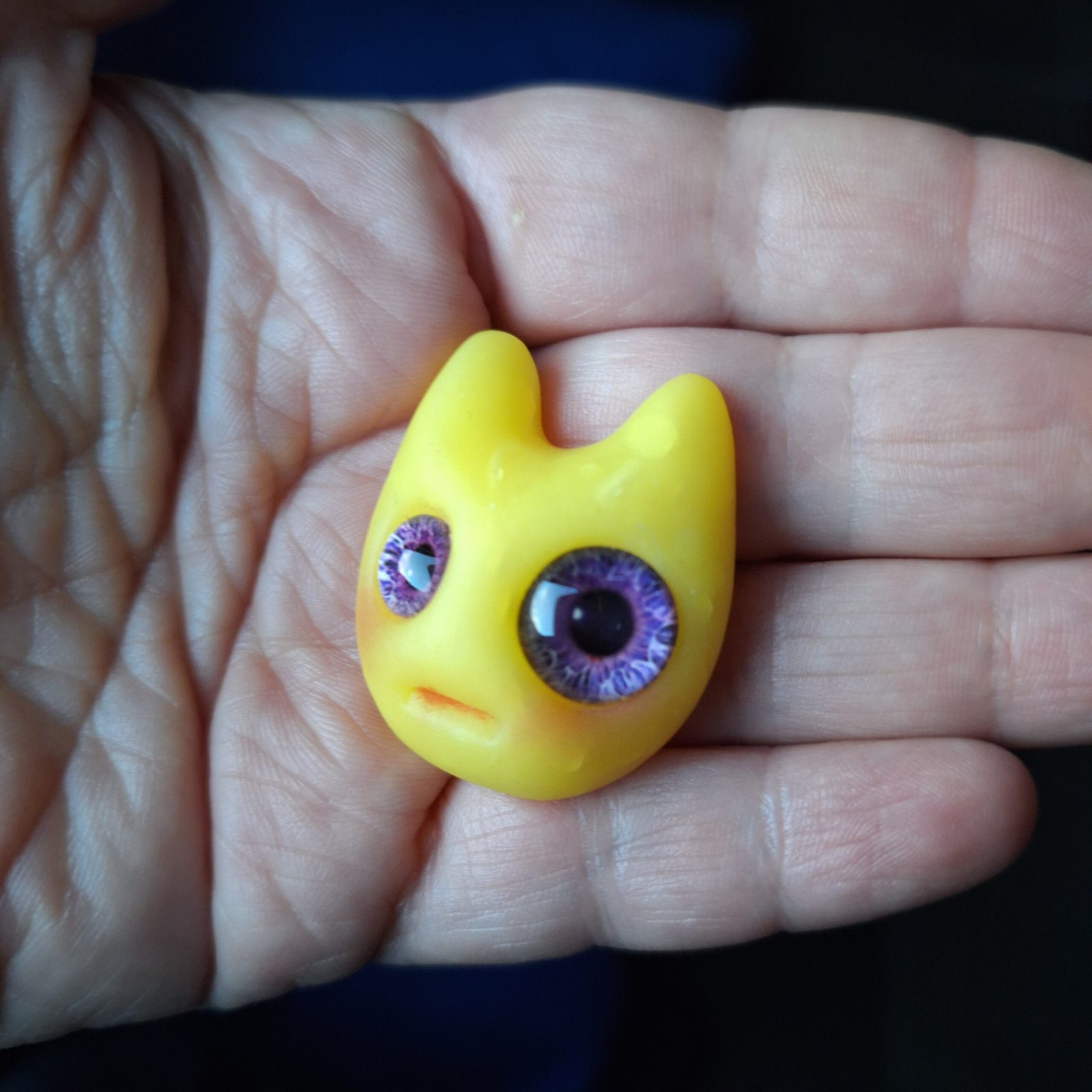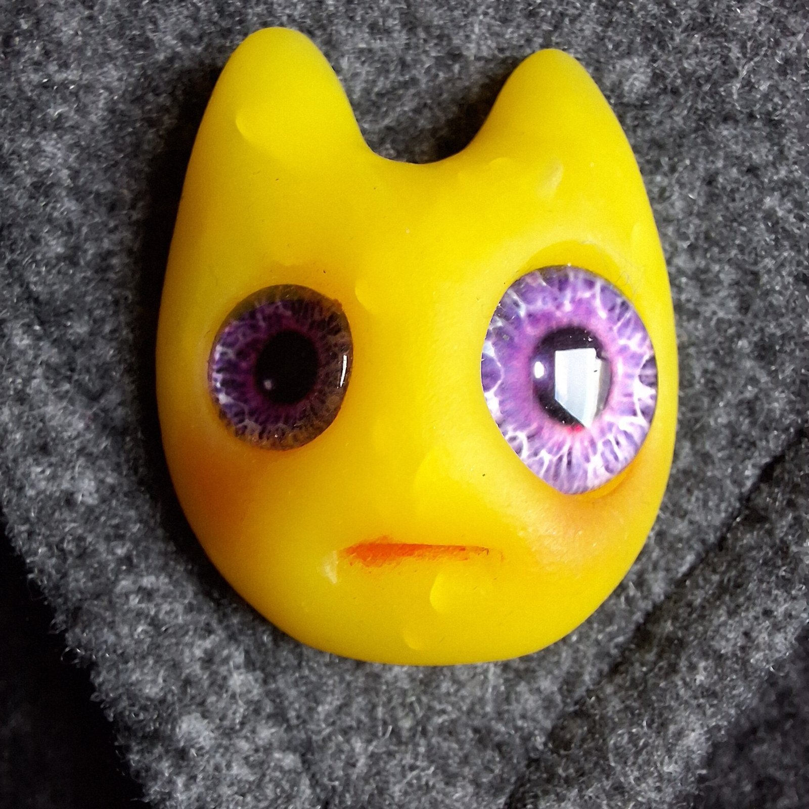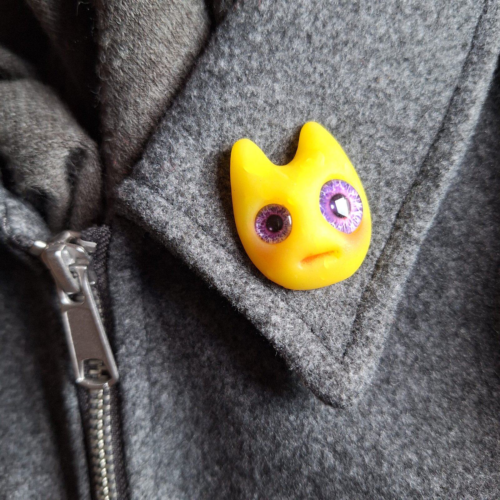 Petit Pin’s  sculpté en pâte polymère, yeux en verre. Sa taille en centimètres  se trouve sur la seconde photo. Pièce unique.